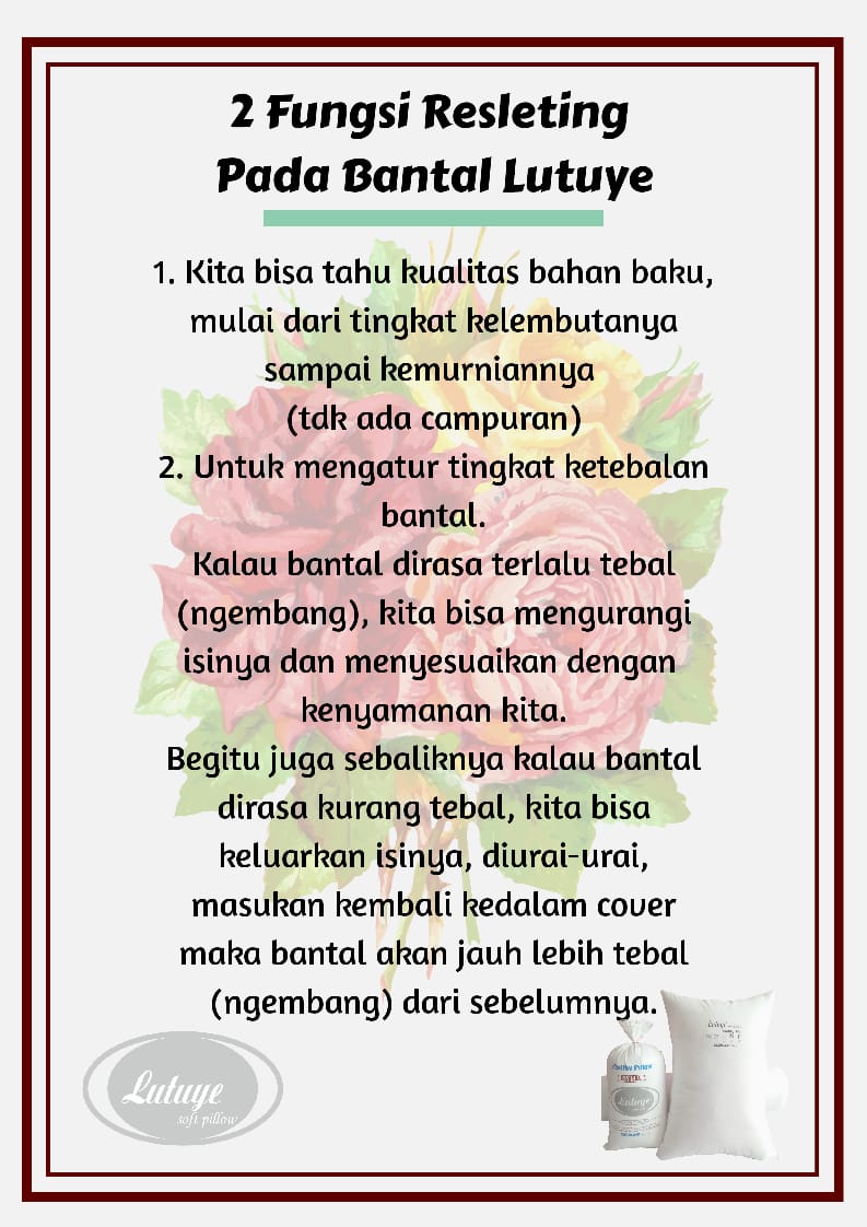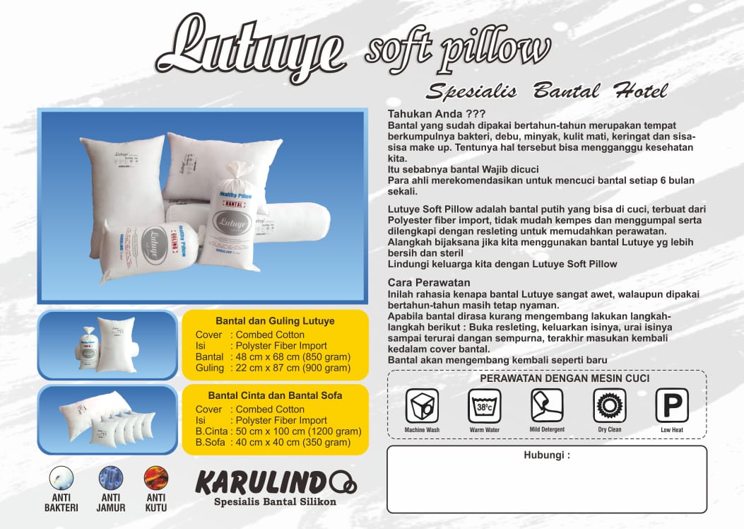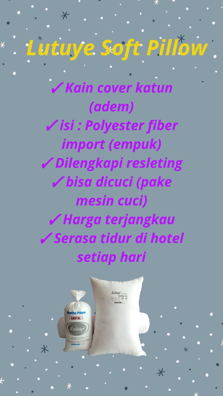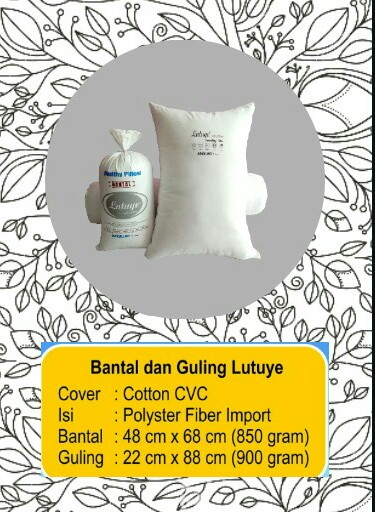 Lutuye Bantal & Guling. Isi 100% Polyter Fiber Import ( silikon ). Cover 100% Katun Kombet & tidak panas. Anti bakteri, anti jamur, anti debu, anti alergi lebih lembut. Membuat tidut lebih nyenyak. Barang berkualitas
