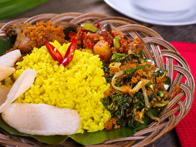 Nasi berwarna kuning dengan lauk pauk komplit