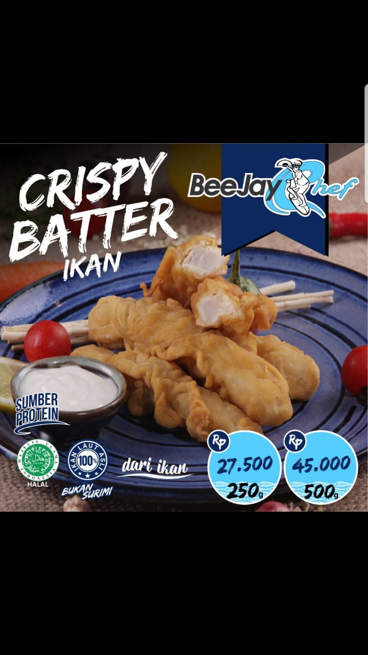 Crispy Batter adalah ikan Kakap fillet dan dilumuri tepung dengan batter gurih batter dan rasa ikan kakap yang khas membuat produk ini enak disajikan dan sehat. Terdapat dua Varian kuantity